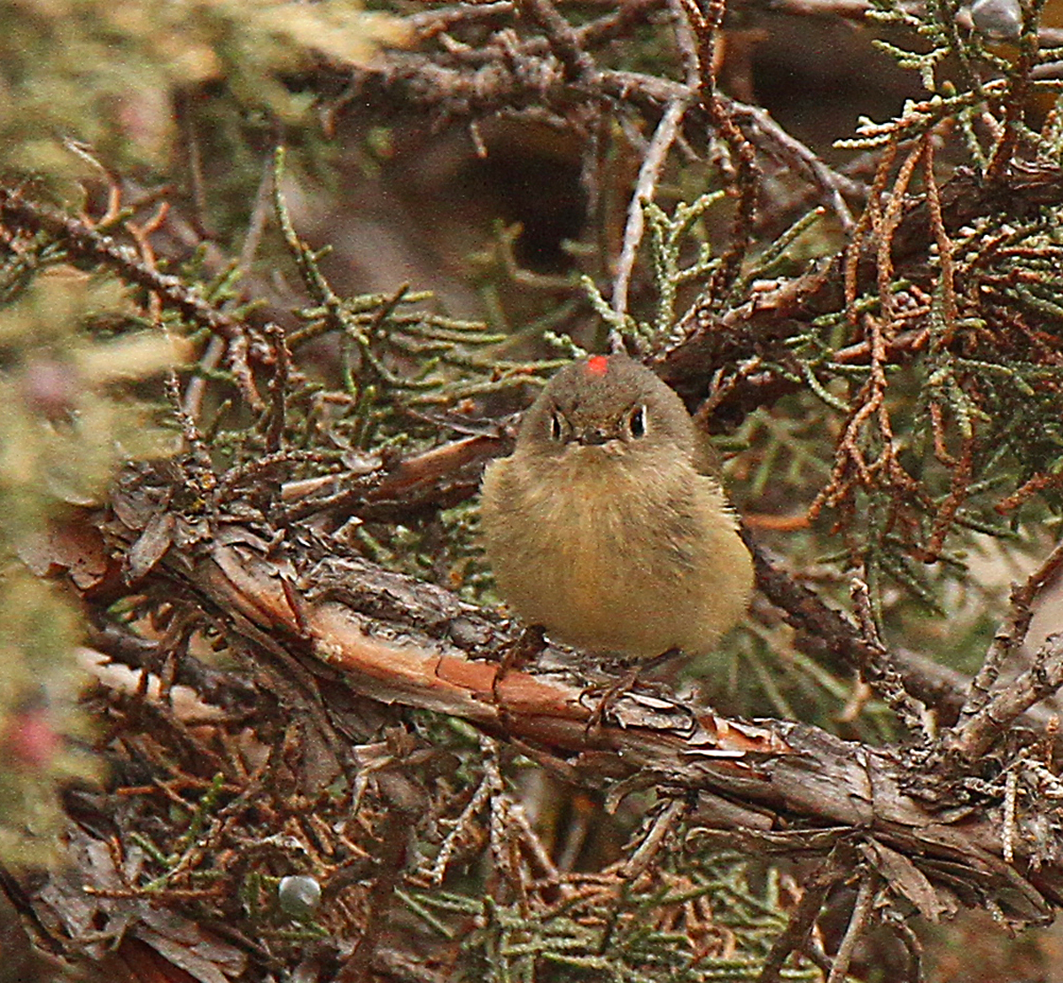 This isn't a great shot but I like it. Ruby crowned kinglet flitting around in junipers by the river. They don't show their ruby hat very often.Attachment 17600