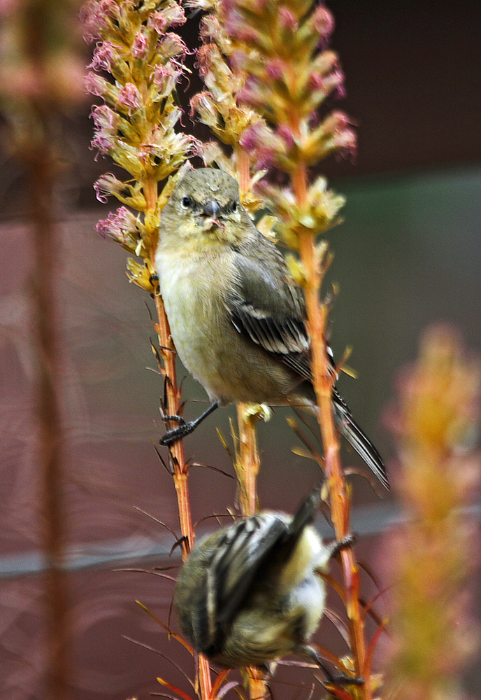 Lesser goldfinches feeding on liatris blossoms Oct 2025.